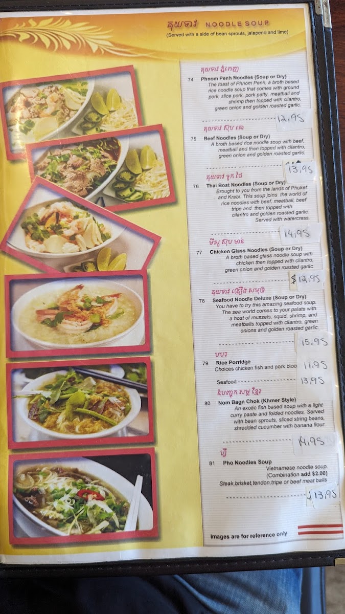 Khmer style. A fish-based soup with a light curry paste and folded noodles. Served with bean sprouts, sliced string beans, shredded cucumber with banana flour. Served with a side of bean sprouts, jalapeño, and lime.